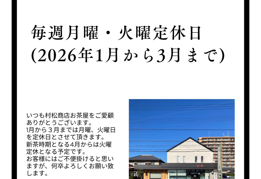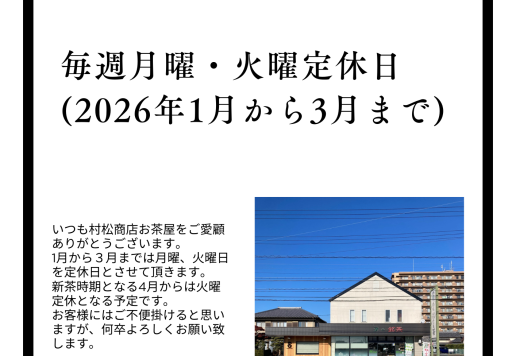 1月〜3月の定休日変更のお知らせ いつも当店をご利用いただき、誠にありがとうございます。 誠に勝手ながら、2026年1月〜3月の期間、これまでの火曜定休に加え月曜日も定休日とさせていただきます。 ■対象期間 2026年...